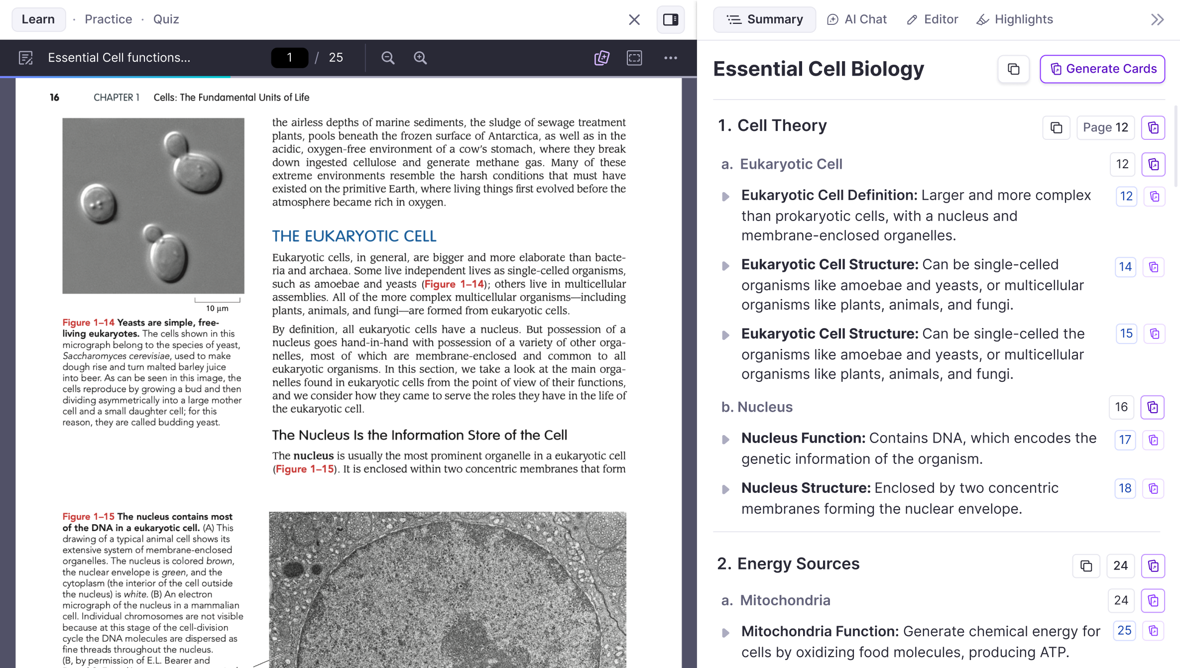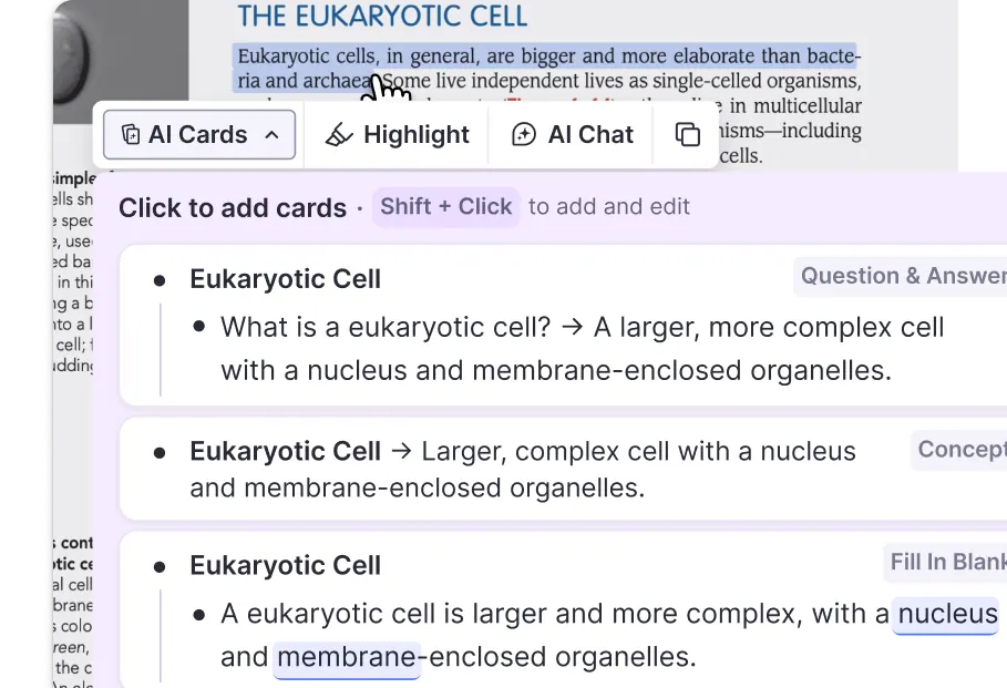 Turn your saved highlights into flashcards instantly for focused, spaced-repetition practice.