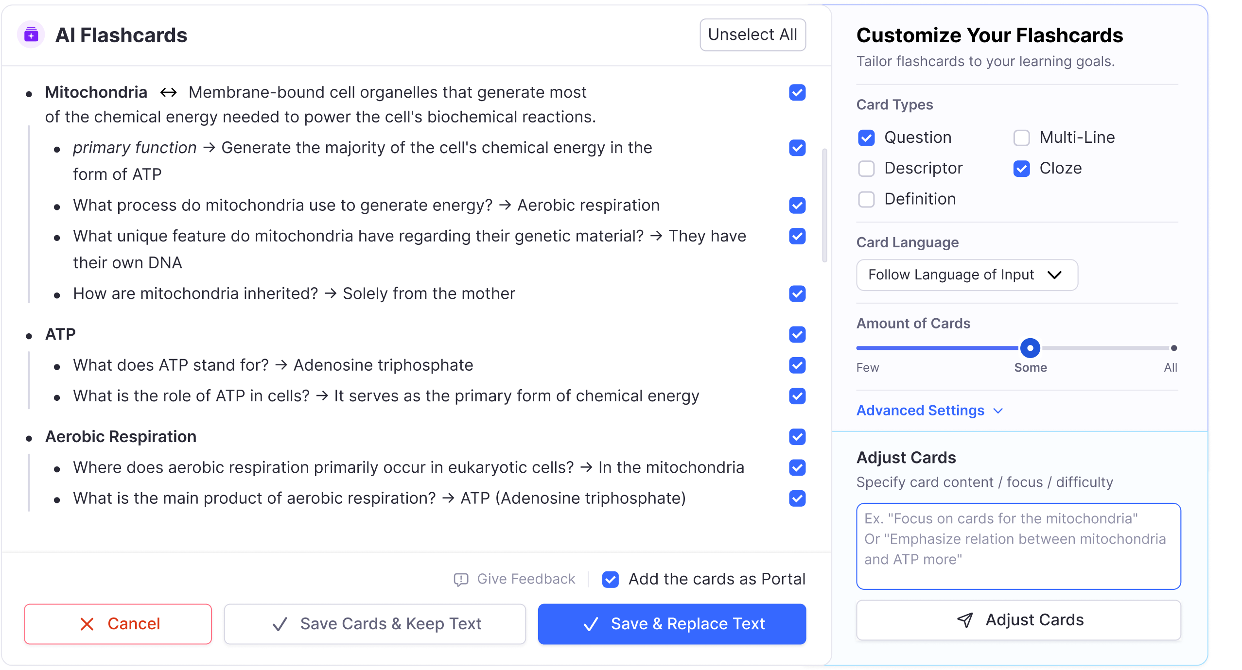 Create flashcards directly within your notes to effortlessly generate personalized practice material. Learn anything from Spanish to Calculus to Medicine, and get higher grades while spending less time studying.