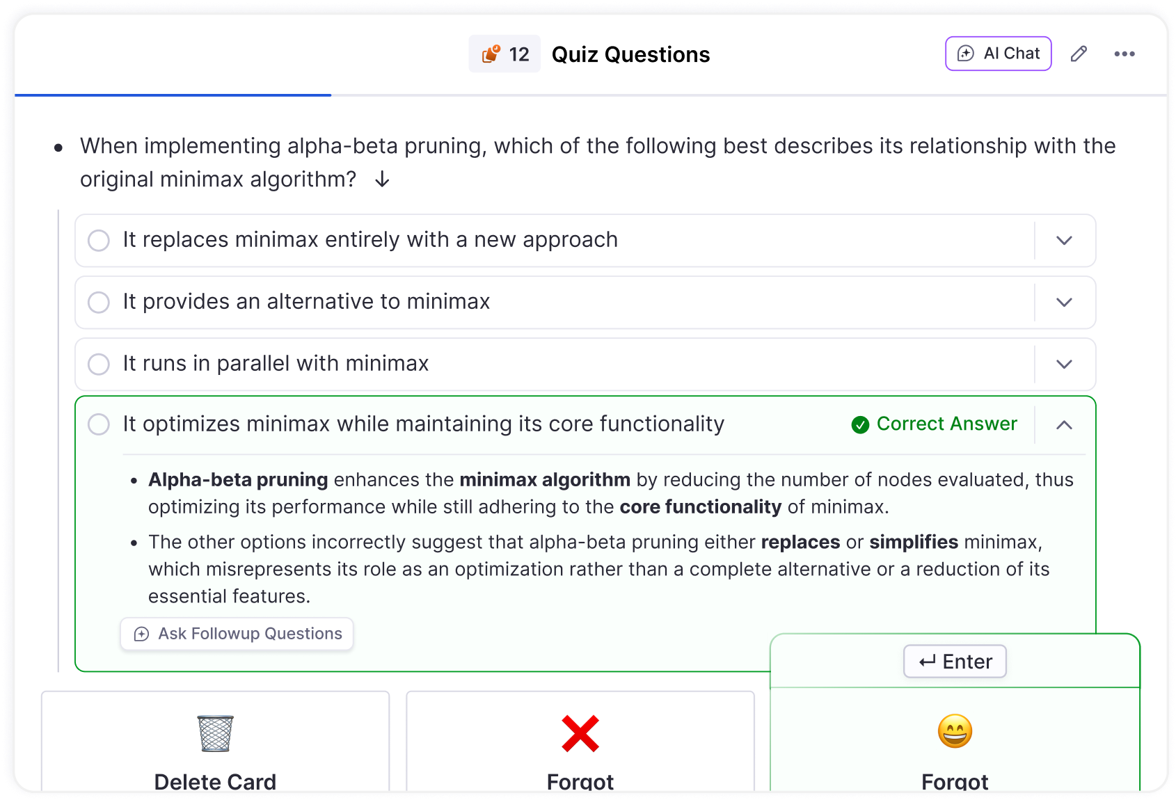 Use evidence-based memory techniques to create flashcards that resurface at the best time for retention, right within your notes.