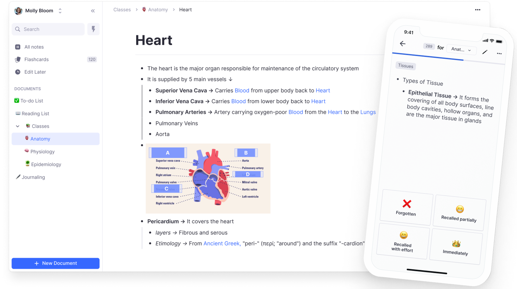 Take notes in our flexible bullet-point editor. Organize, tag, and link notes to build a comprehensive Knowledge Base that keeps all of your study materials in one place.